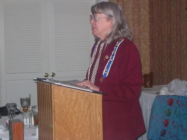 Dr Mary Collins presenting program on INDIAN SCHOOLS at monthly James Wood Chapter meeting, Parkersburg Country Club